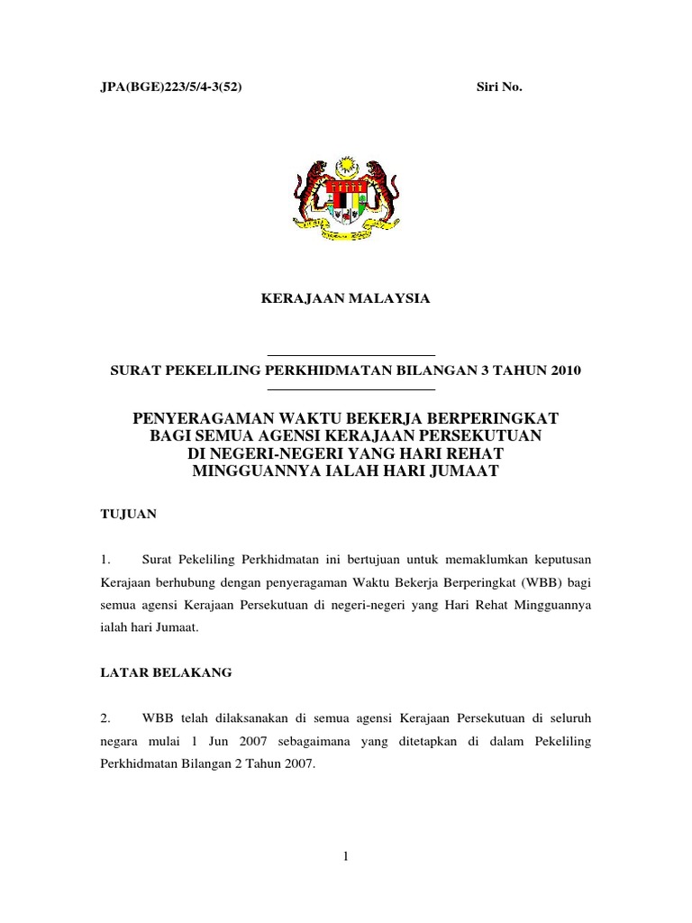 Spp Bil 03 2010 Pekeliling Penyeragaman Waktu Bekerja Berperingkat Bagi Semua Agensi Kerajaan Persekutuan Di Negeri Negeri Yang Hari Rehat Mingguannya Ialah Hari Jumaat Pekeliling Terbaru Kerajaan