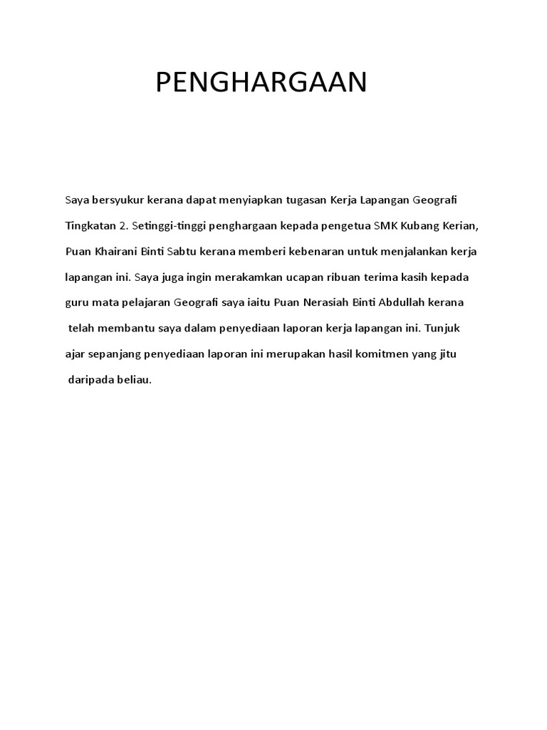 Bahan-Bahan Rujukan dan Contoh. 11 Penghargaan Pertama saya ingin mengucapkan ribuan terima kasih kepada pengetua Sekolah Menangah Kebangsaan Seafield iaitu Datin Aisah binti Jaman kerena beliau telah. Kerja Lapangan Tugasan Geografi Tingkatan 3.