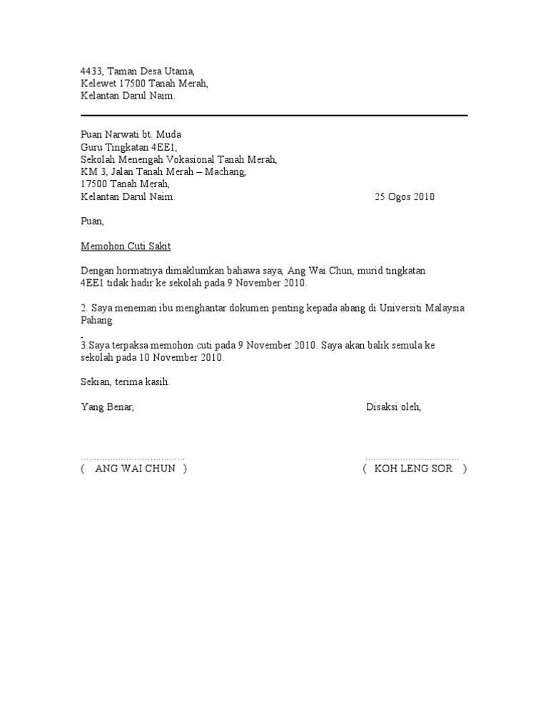 . Contoh surat rasmi tidak hadir ke sekolah cuti sakit. Saya akan kembali masuk kerja pada tanggal 9 oktober 2020 dan akan. 3sehubungan itu saya amat berbesar hati.